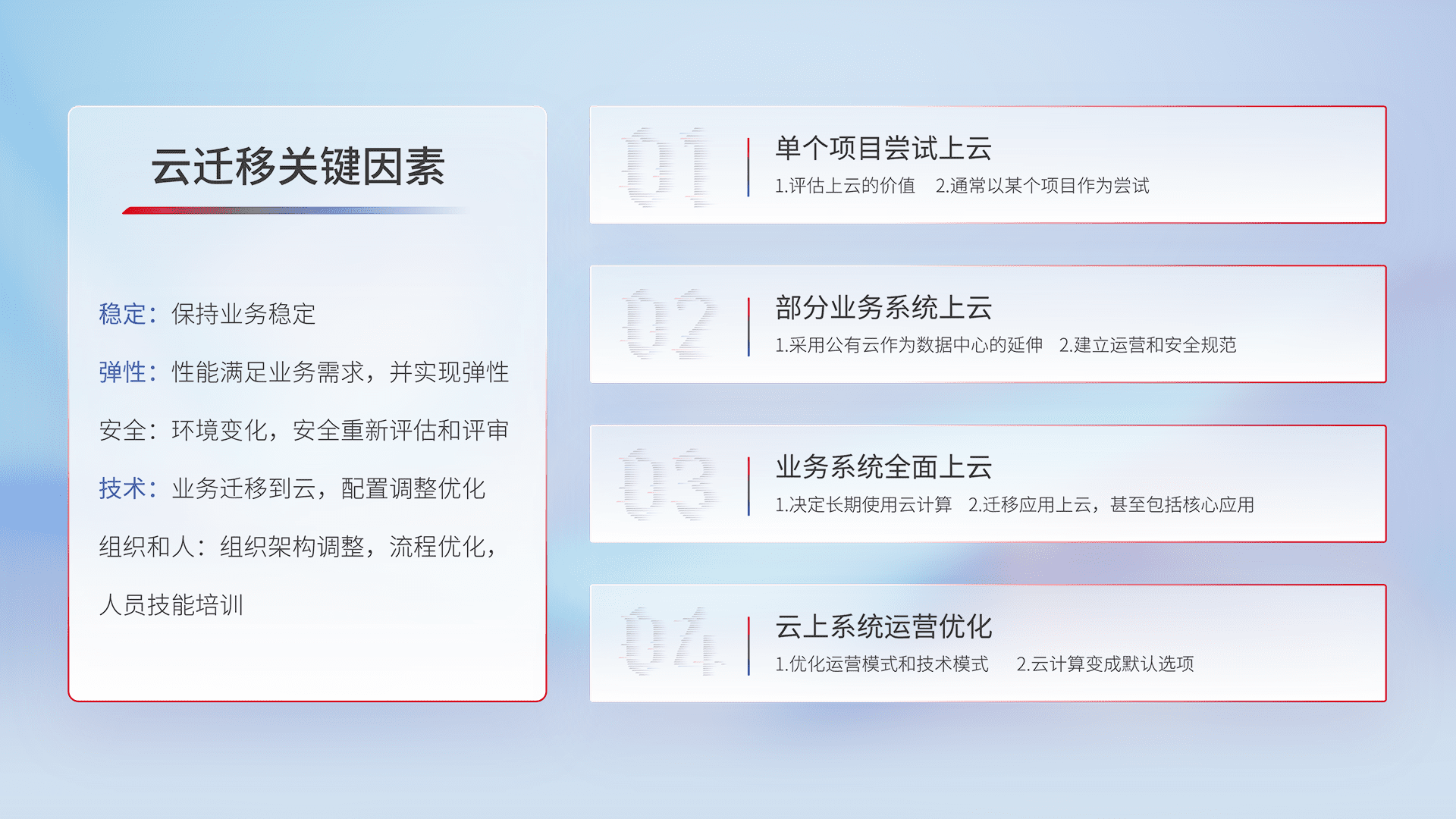 结合实际业务,,,,从规划设计、、、、云平台选型、、、、云原生改造、、、数据迁移、、集成交付,,迁移全过程为客户识别最佳上云路径,,做好风险识别管理,,,,设计网络架构、、身份权限、、、安全审计合规、、、、操作审计、、、、日志审计、、、监控告警策略、、多站点容灾设计等,,,对云上基础设施进行整体规划,,,,提升IT治理水平,,,以满足弹性、、高可用、、高性能的需求。。。